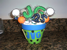 This is a baby shower centerpiece cookie bouquet I made for a friend of mine. A few weeks ago I made one similar for a girl baby shower and they turn out really cute. The centerpiece is used for the shower and the cookies are individually wrapped for the guests to take home as a favor. Then the basket with the goodies is for the Mom-To-Be to have as a gift. These are $50 and includes a dozen cookies and the basket of gifts. If you provide your own basket to be stuffed with cookies the cost would be $35 for the dozen cookies.
